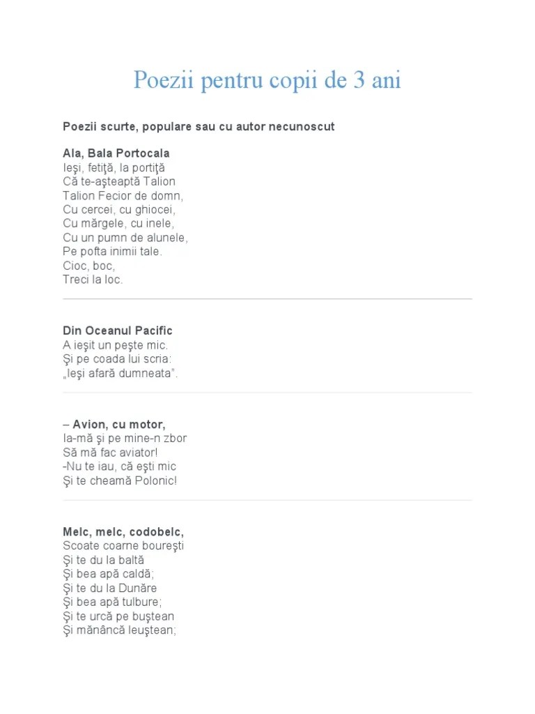Întrebări și răspunsuri frecvente despre poeziile pentru copii. Azi e ziua ta, să fii fericită. Poezii scurte, populare sau cu autor necunoscut. De ce sunt importante poeziile pentru copilul de 3 ani. Am facut o lista cu cele mai frumoase poezii pentru copii. Poezii pentru copiii de 3 ani. Ala, bala portocala ieşi, fetiţă, la portiţă. Cele mai cunoscute și mai frumoase poezii pentru copii, 2016. Invatati impreuna poezii pentru gradinita, poezii pentru mos craciun, poezii cu anotimpuri si . See more ideas about poezii, versuri pentru copii, . 639,671 views jun 2, 2016 . Poezii pentru copii de 3 ani înseamnă poezii scurte, cu rime clare, ușor de memorat, care conțin cuvinte cât mai simple.
